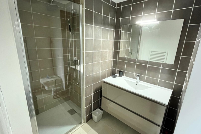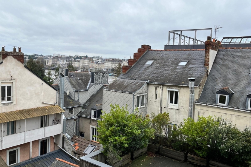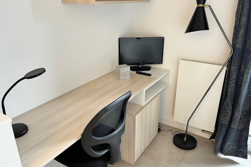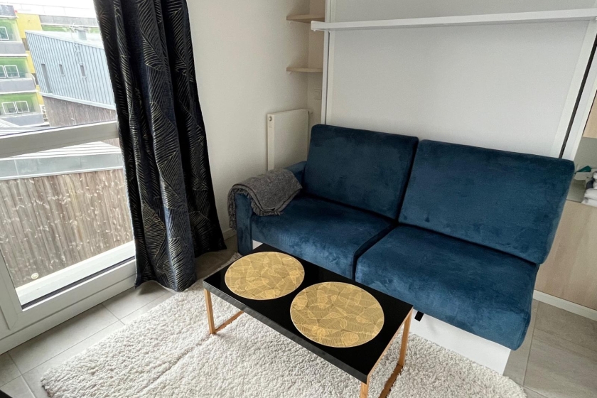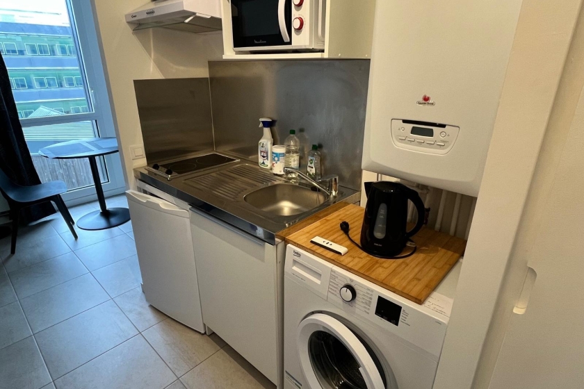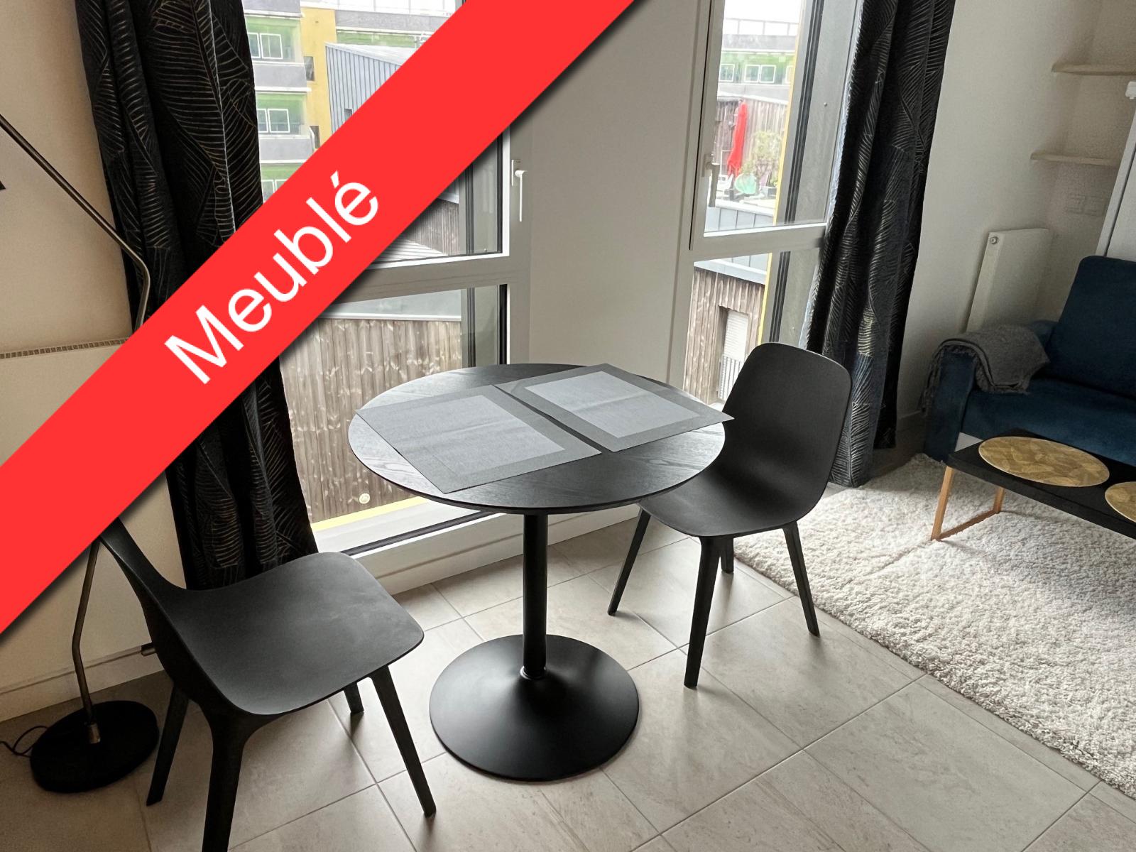 NANTES - LES MACHINES DE L'ILE - Appartement 1 pièce de 21 m² - Dans une résidence récente, un bel appartement meublé lumineux de type 1 de 21m² situé au 4ème étage avec ascenseur comprenant : une entrée avec placard, un séjour avec un coin cuisine aménagée et équipée (plaques, hotte, rangements, machine à laver, micro-onde), une salle d'eau avec WC.