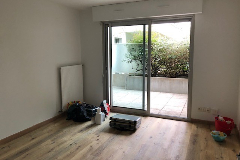 A LOUER - NANTES - CITE DES CONGRES - Appartement 2 pièces de 29.89 m² - Au cœur de ce quartier recherché, à deux pas de l'hyper centre, des transports (tramways ligne 1/2/3, bus et busway ligne 4), commerces et de la gare, appartement de 2 pièces de 29.89 m². Situé en rez-de-jardin de cette résidence sur les bords du canal St Félix, ce logement est composé d'une entrée avec placard, d'un séjour avec cuisine ouverte aménagée et équipée (plaques de cuisson gaz et réfrigérateur) le tout donnant sur une terrasse privative de 17m² avec vue sur les espaces verts de la copropriété, d'une chambre et d'une salle d'eau avec WC.