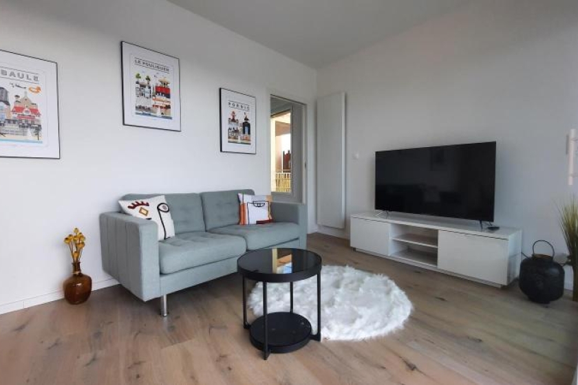 A LOUER - Appartement T2 Meublé - NANTES Vue LOIRE - Appartement T2 MEUBLE de 45.44m2 sur les bords de la Loire, à proximité du centre commercial BEAULIEU et des transports, dans une résidence de 2023 situé au 8ème étage avec ascenseur. L'appartement comprend, une entrée, une pièce de vie avec une belle cuisine aménagée et équipée (Four, hotte, plaques), un GRAND balcon de 12.44m² exposé sud-ouest donnant directement sur la Loire sans vis à vis, une salle d'eau avec WC et une chambre avec DRESSING et BUREAU. De nombreux rangements.