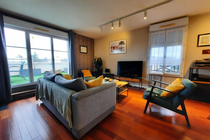 A LOUER - NANTES - ROUTE DE SAINTE LUCE - Appartement MEUBLE 2 pièces de 60m² - TERRASSE 28m² - PARKING - Un grand appartement 2 pièces meublé d'une superficie de 60m². Situé au 3ème étage et dernier étage avec ascenseur, ce logement vous offre une entrée avec cellier, un salon/séjour lumineux avec cuisine ouverte aménagée et équipée le tout donnant sur une terrasse de 28m² exposé Sud-Ouest. L'espace nuit est composé d'une chambre avec placard, une salle de bain et WC séparé.