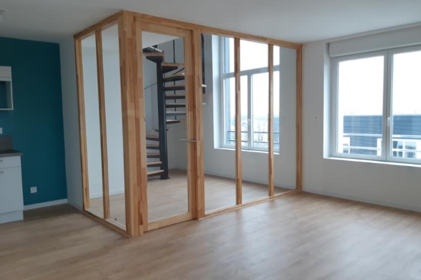 A LOUER - T3 DUPLEX - NANTES - Beaujoire - LOI PINEL - A deux pas des transports, bel appartement de 3 pièces en DUPLEX de 66.46 m². Situé au 7ème étage de cette résidence avec ascenseur, ce logement lumineux vous offre au 1er niveau une entrée avec placard et cellier, une beau séjour lumineux avec une cuisine ouverte aménagée et équipée (plaques de cuisson, hotte et four) le tout donnant sur une loggia de 7.71 m² exposée nord-ouest avec escalier pour atteindre l'étage. Au second niveau un dégagement dessert 2 chambres, une salle d'eau et WC séparés. Un stationnement privatif couvert. Chauffage et eau chaude individuels électriques.