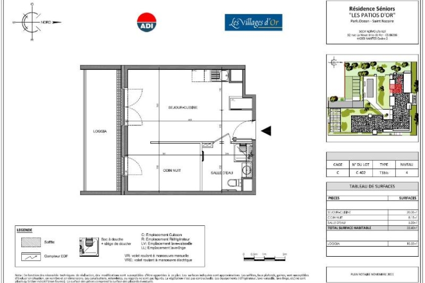 Au sein d'une résidence seniors de 2013, Au 4ème étage un appartement de type T1 bis de 33m² comprenant une pièce de vie avec coin cuisine aménagée et équipée (plaque et hotte), un coin nuit.