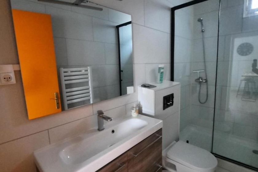 Au sein d'un petit immeuble, au 1er étage, un appartement de type 2 d'une surface de 34 m² comprenant une entrée avec placard, une pièce de vie avec coin cuisine aménagée et équipée, une chambre, une salle d'eau avec WC.