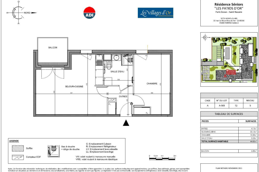 Au sein d'une résidence séniors de 2013, au 5ème et dernier étage, un appartement de type 2 d'une surface de 44m² comprenant une entrée avec placard, une chambre avec placard, une salle d'eau avec wc, une pièce de vie avec coin cuisine aménagée et équipée (plaque et hotte). Terrasse exposée ouest.