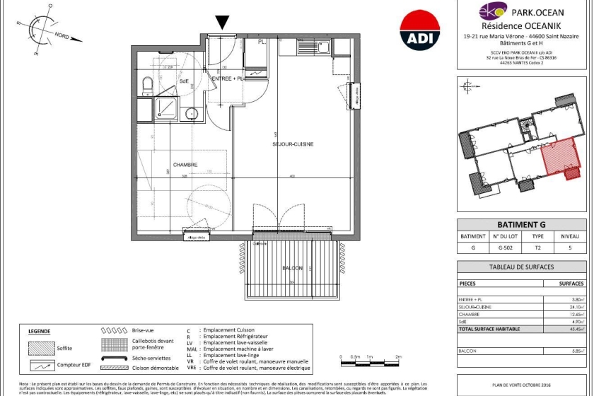 Au sein d'une résidence de 2018 sécurisée avec ascenseur, un appartement de type 2 au 5ème étage d'une surface de 44m² comprenant une entrée avec placard, une pièce de vie avec cuisine ouverte aménagée et équipée (hotte, plaque et frigo), une salle d'eau avec wc. Une terrasse.