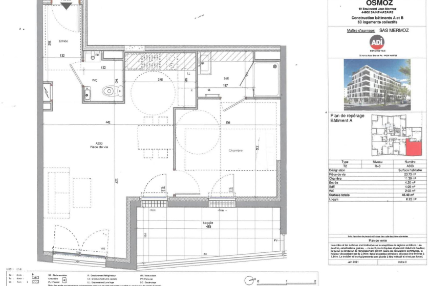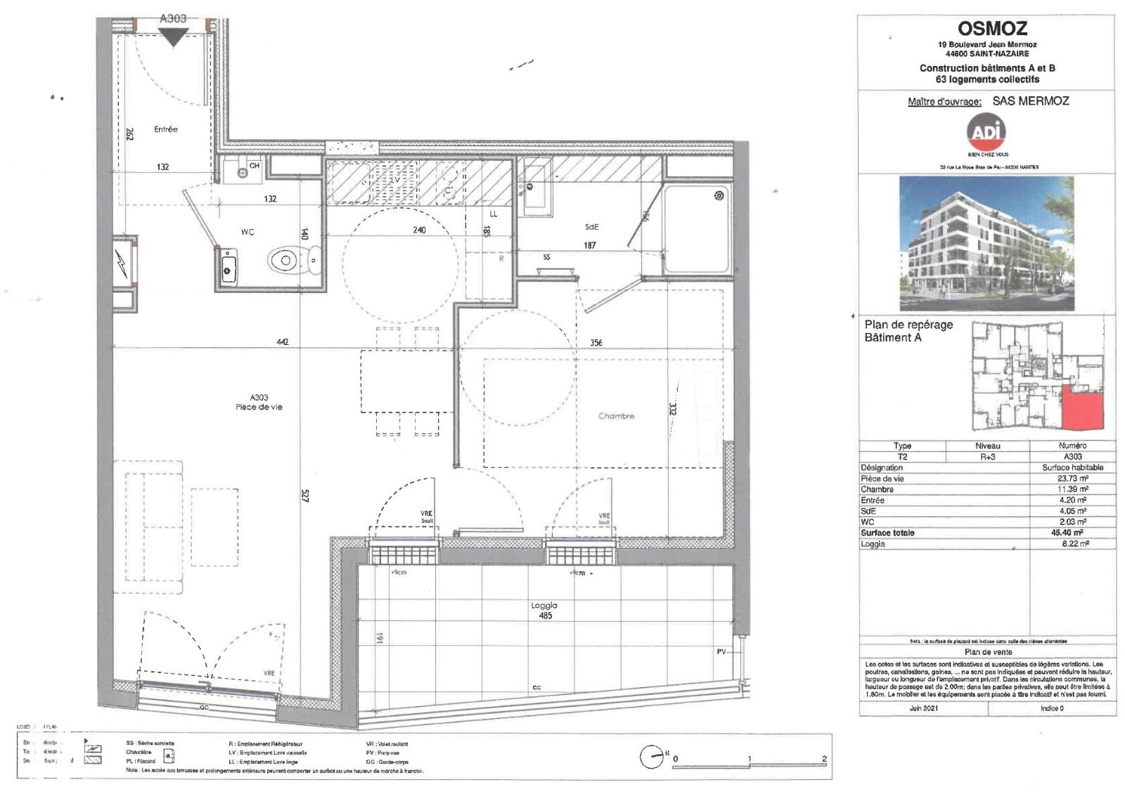 Au 3ème étage un appartement de type 2 d'une surface de 45m² comprenant une entrée, une pièce de vie avec coin cuisine aménagée et équipée (plaque, hotte et four), une salle d'eau, wc, une chambre, une terrasse