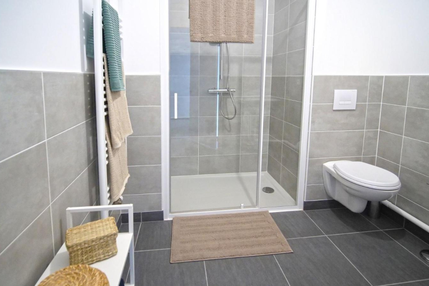 Appartement de Type 5 meublé comprenant : une entrée avec 4 placard, une cuisine aménagée et équipée donnant sur un salon/séjour, une terrasse, 4 chambres, 1 salle d'eau avec WC, et 1 douche et WC séparés.