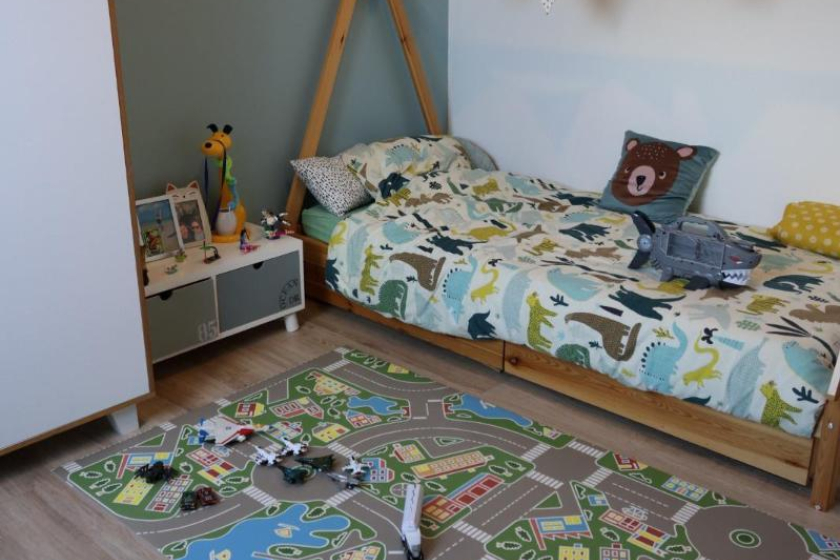 Au 1er étage, deux chambres dont une avec dressing, un bureau, une salle de bains avec douche et baignoire. Au dernier étage, deux chambres et sanitaires.