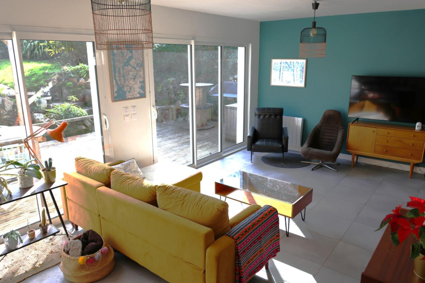 Maison d'habitation meublée de type 5 d'une surface de 131m² comprenant une entrée, une buanderie avec douche, une pièce de vie avec une cuisine aménagée et équipée donnant sur un jardin cloc et arboré avec sa terrasse en bois.